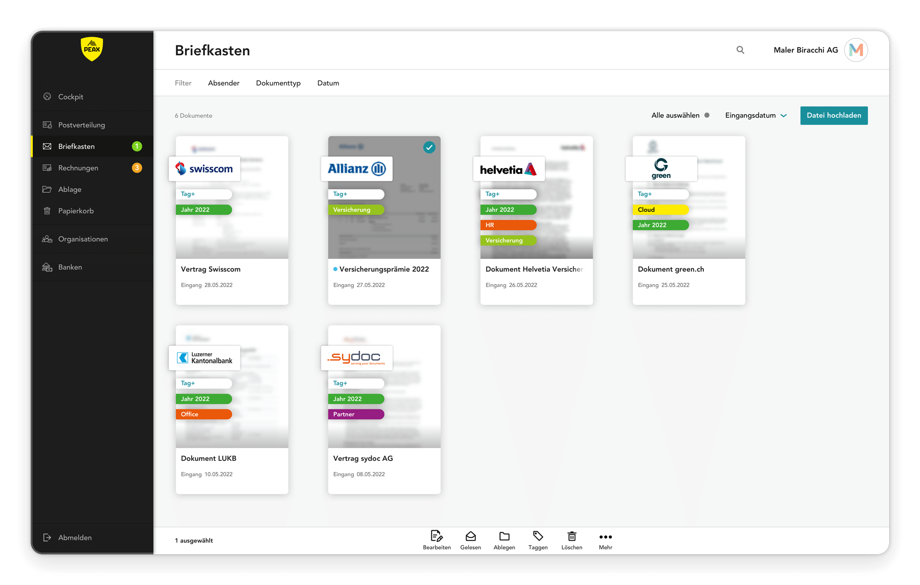 Als digitaler Briefkasten ist PEAX der Ausgangspunkt einer durchgängig digitalen Administration. Nur wenn alle Informationen und Dokumente von Anfang an digitalisiert und strukturiert zur Verfügung stehen, kann automatisiert damit weitergearbeitet werden, z.B. in der Buchhaltung oder in einem ERP.